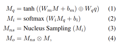 M_{ns} 에서 Nucleus Sampling에 의해 선택된 point는 1로, 나머지는 0으로 설정합니다. 이후에 M_{ns} 와 M 을 곱해 output인 M_{o} 를 얻습니다. M_{o} 는 어떤 position에서는 0을 갖는 sparse tensor라고 말할 수 있습니다.