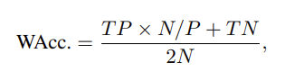 IEMOCAP 데이터셋의 경우 accuracy와 F1-Score를 evaluation metrics로 가져갑니다. CMU-MOSEI 데이터셋의 경우 weighted accuracy를 사용하는데 이는 데이터셋이 imbalanced 하기 때문입니다. weighed accuracy 식은 아래와 같습니다.