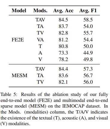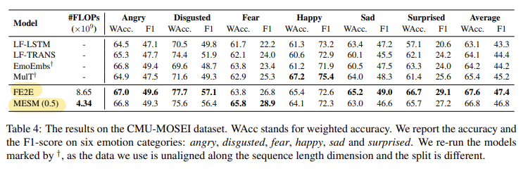 Table 3은 IEMOCAP 데이터셋에서의 실험 결과를 정리한 것입니다. 논문의 저자가 제안한 FF2F (fully end-to-end model)가 SOTA를 달성했다는 것을 확인할 수 있고, 연산량을 대폭 낮춘 MESM도 좋은 성능을 보이는 것을 확인할 수 있습니다.