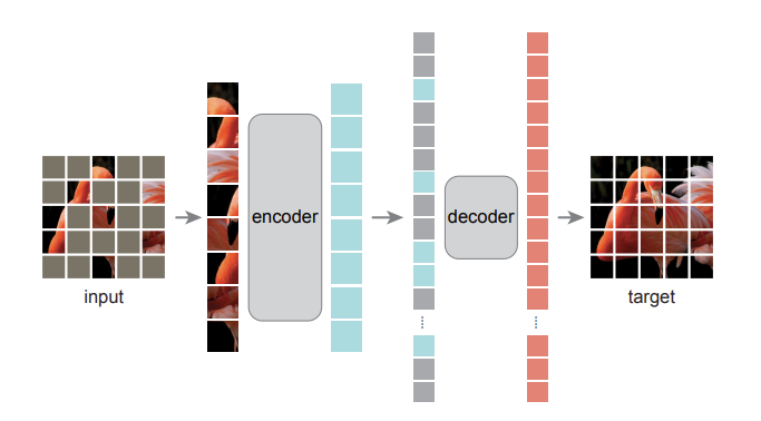 Patch 단위로 나뉘어진 입력에 대해서 Random으로 마스킹을 진행합니다. 가장 왼쪽 그림에서 input 부분을 보면 군데 군데 비어있는 것을 확인하실 수 있을 것입니다. 그리고 여기서 마스킹 되지 않은 visible token에 대해서만 ViT encoder를 태워줍니다. 그림으로 보면 확인할 수 있습니다.