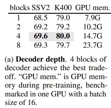 별다른 내용은 없고 ImageMAE와는 다르게 VideoMAE에서는 decoder의 depth에 따른 유의미한 성능 차이가 존재하네요. width 같은 경우는 테이블에 나와있지 않지만 Encoder의 절반을 default로 사용한다고 합니다. ImageMAE와 동일하게 비대칭적인 encoder-decoder 구조를 가지고 있으며 decoder는 lightweight로 가볍게 가져간다고 합니다.