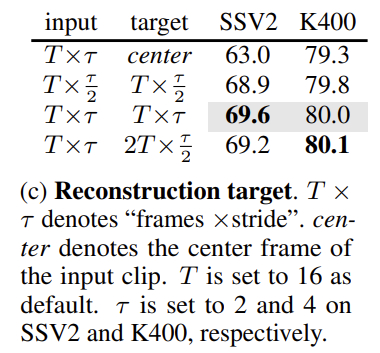 Reconstruction의 대상도 ablation 했습니다. 우선 center frame 하나 만을 예측하는 것은 가장 낮은 성능을 보여주고 있습니다. 성능을 보니 frame 하나 만을 예측하는 것은 trivial solution에 수렴하는 모양입니다. 클립을 예측할 때는 stride에 민감하게 반응하는 것을 확인할 수 있습니다. 음 여기서는 뭔가 큰 의미를 찾기 어려워 보입니다.