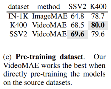 결과는 사전 학습 데이터의 양을 줄여도 학습 시간을 충분히 가져가면 오히려 성능이 더 높아지는 경향을 보여주고 있습니다. 이를 통해 domain shift(Kinetics->SSV2) 역시 중요한 요인이지만 데이터의 ‘질’도 중요하다는 것을 보여주고 있습니다. Kinetics의 양을 1/4 정도로 줄여도 전부 사용하는 것보다 더 높은 성능을 달성할 수 있는 것을 보아 VideoMAE는 적은 데이터의 상황에서도 효과적으로 학습할 수 있다는 것을 다시 한번 보여주고 있습니다.