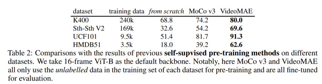 여기서는 scratch 학습 그리고 contrastive pretraing 방식인 MoCo v3 그리고 VideoMAE를 비교하고 있습니다. 일단 VideoMAE가 모든 데이터 셋에 대해서 가장 좋은 성능을 보여주고 있는데 여기서 한 가지 흥미로운 점은 UCF101 이나 HMDB51과 같은 데이터의 수가 적은 데이터셋일 때 VideoMAE는 여전히 건재한 성능을 보여준다는 점입니다.