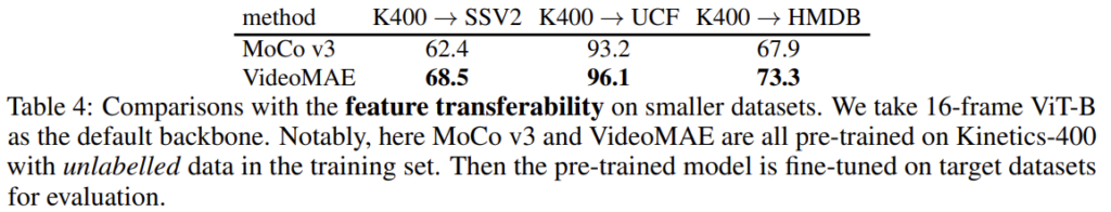 아래의 테이블(4)을 보면 feature transferability를 볼 수 있습니다. Kinetics로 사전 학습 하고 다른 데이터 셋으로 finetuning 했을 때의 결과 입니다. 모든 상황에서 MoCo v3 보다 나은 결과를 보여주기 때문에 저자는 feature transferability가 더 좋다고 주장하지만 저는 개인적으로 애초에 VideoMAE의 기본 성능 자체가 높은 거 때문이 아닌가라는 생각이 드네요. 진실은 알 수 없지만 뭔가 조금 애매한 것 같네요..
