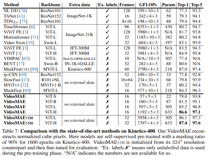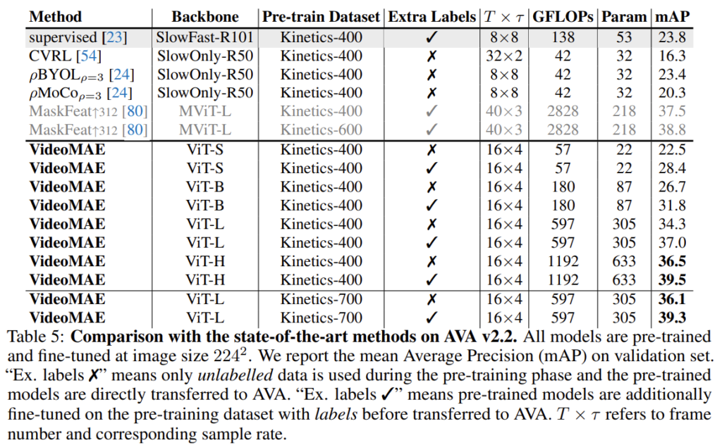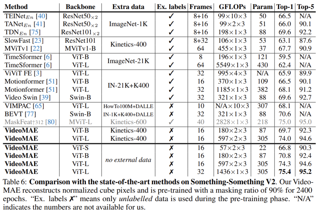 SSV2에서의 action recognition에 대한 down stream benchmarking 입니다. 다른 방법론 대비 FLOPs를 더 적게 가져가면서 더 높은 성능을 보여주고 있습니다 .더군다나 다른 방법론은 extra data를 사용해야만 SSV2에서 어느 정도 수렴을 하는 반면 VideoMAE는 별다른 extra data 없이도 좋은 성능을 보여주고 있다는 점이 인상 깊습니다.