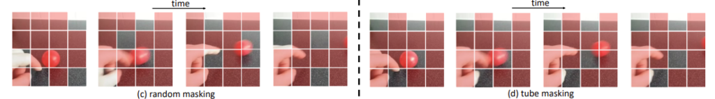 그림 (c)를 보면 random masking을 수행하고 있는데 여기서 인접한 4개의 프레임에 대해서 masking 되지 않은 영역만 모아도 원래 클립을 쉽게 유추할 수 있습니다. 즉, masking 된 부분에 집중을 하지 못하고 reasoning 능력이 길러지지 않는다는 주장이죠. 따라서 그림 (d) 처럼 tube masking 이라 해서 인접한 4개의 프레임에 대해 masking 되는 영역을 동일하게 가져가면 모델 입장에서는 쉽지 않게 즉, non-trival 하게 학습을 진행할 수 있습니다.