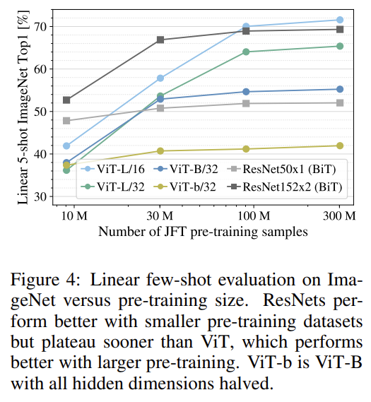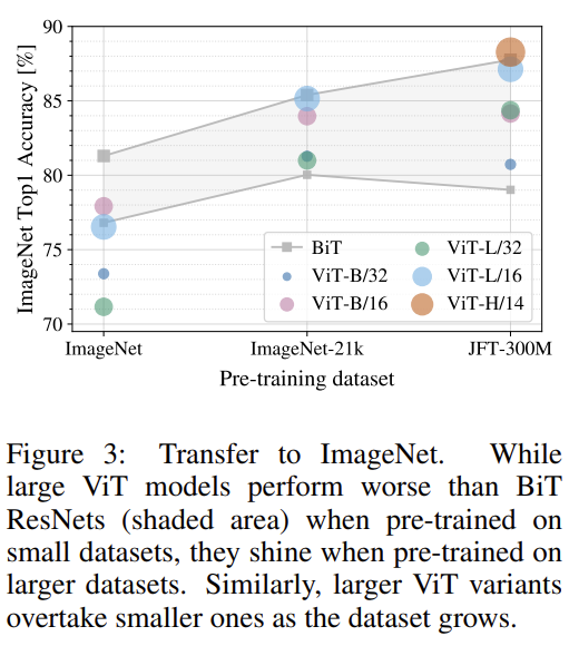 • 모델이 매우 커지면 성능이 어느 정도 saturation 되는 ResNet 대비 ViT는 saturation 되는 양상을 보이지 않습니다. 훨씬 더 큰 scale 에서 성능을 기대해볼 수 있다는 점을 시사하는 것 같네요.