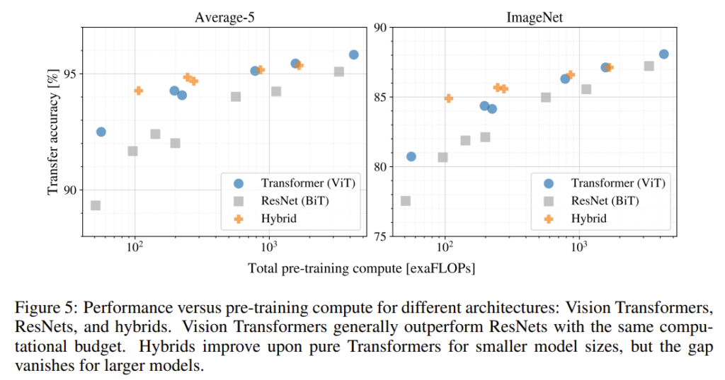 • Hybrid 방식이 vanilla ViT 보다 살짝 더 효율적이라는 것입니다. Hybrid 방식은 Patch를 Linear Projection 시키는 것이 아니라 CNN의 intermediate feature를 가지고 ViT에 태운 것이라 보면 됩니다. 계산량이 적은 영역에서는 Hybrid 방식이 vanilla ViT 모델보다 더 좋은 성능이 나온 것을 확인할 수 있었고 이는 convolutional local feature processing이 ViT의 성능 향상에 도움이 된다는 것을 보여주는 것 같습니다.