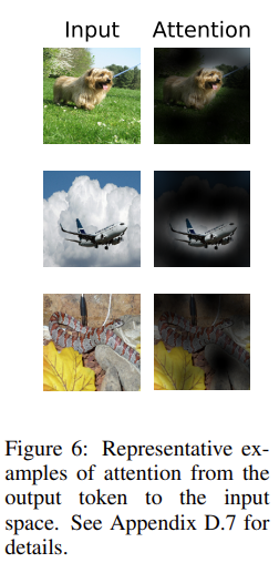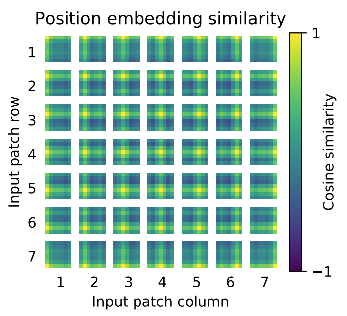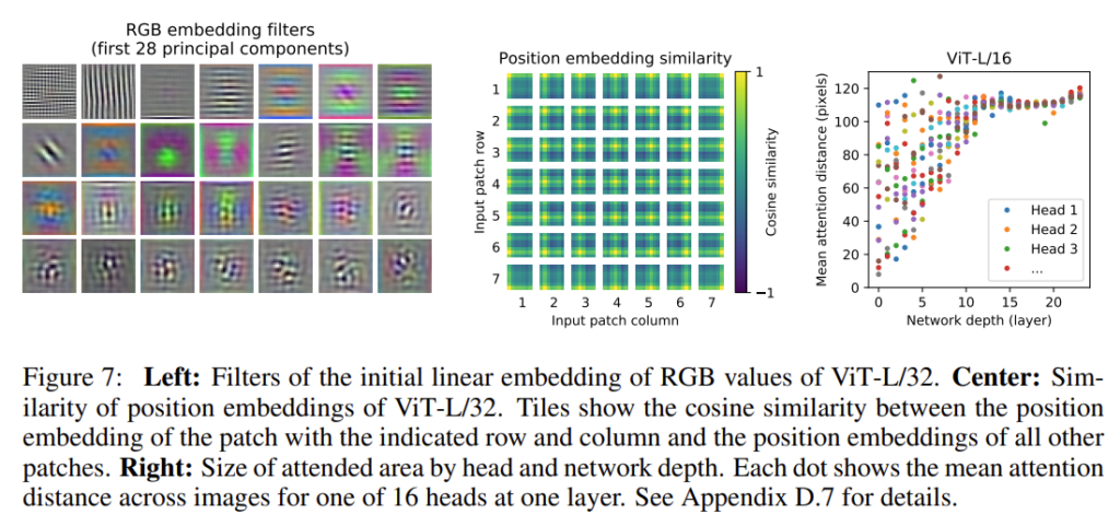 다음으로 위의 그림에서 가장 중앙 그림을 보면 positional embedding 유사도를 시각화 하였네요. 이 시각화는 정말로 Positional Embedding vector가 데이터의 위치를 잘 표현하도록 학습이 되었다는 점을 보여줍니다. 패치 마다 임베딩 벡터가 있을 것이고 모든 패치에 대응되는 벡터 끼리 유사도 행렬을 계산했을 때 패치의 위치와 유사도 행렬이 크게 activate 되는 부분이 일치하는 것은 positional embedding이 잘 학습 되었다고 볼 수 있겠죠.