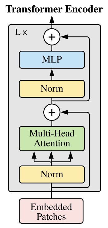 Embedded Patch 들이 준비 되면 그 다음에는 L개의 연속적인 Transformer Block을 태워주면 됩니다. Encoding Layer를 여러개 거쳐서 나온 Class Token에 대한 Representation을 가지고 MLP head를 통과 시켜 Classification Task를 수행하면 됩니다.
