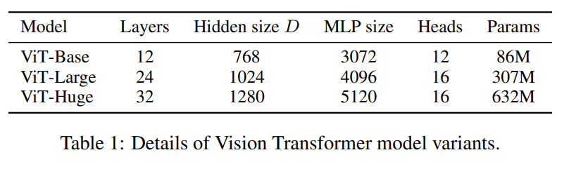 모델 구조에 따른 ViT 정의 입니다. BERT와는 다르게 ViT-Huge라는 대용량 모델까지 정의를 해주었습니다. 예를 들어 ViT-L/16이라는 의미는 ViT-Large 모델을 가져가면서 패치 사이즈는 16 \times 16 로 사용했다는 의미입니다. 이때 패치 사이즈가 작아질 수록 입력 시퀀스의 길이는 길어지므로 모델의 연산량이 더 많아진다고 보면 됩니다.