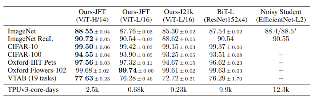 ViT-Huge/14가 대부분의 지표에서 좋은 성능을 보여주고 있습니다. ViT-L/16 같은 경우는 사전 학습 시간이 BiT-L이나 보다 적게 걸림에도 불구하고 더 좋은 성능을 보여주고 있습니다. 위의 벤치마킹에서 BiT-L이나 Noisy Student는 JFT로 사전 학습 되었습니다.