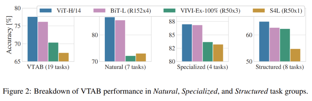 VTAB performance는 각 task당 1000개의 training examples를 사용하여 적은 데이터를 다양한 task에 전이한 성능을 평가하는 방법입니다. 각 task는 크게 Natural, Specialized, Structured의 세 그룹으로 나뉘어 있습니다. Natural은 흔히 접할 수 있는 데이터 imagNet, Cifar등의 데이터이며 Specialized는 의학, 위성 사진 등의 특수 분야의 데이터이고 Structured는 최적화를 위한 위치 정보의 데이터 같은 구조에 대한 데이터로 이루어져 있습니다.