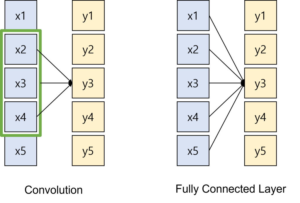 위의 그림을 보면 Convolution과 Fully Connected Layer 간의 차이점을 나타내고 있습니다.