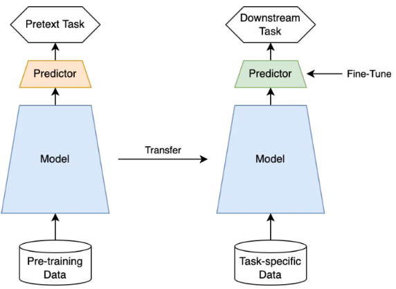 pretext taskdownstream task로 나누어 집니다. 아래 그림이 이를 잘 설명해 주고 있네요.