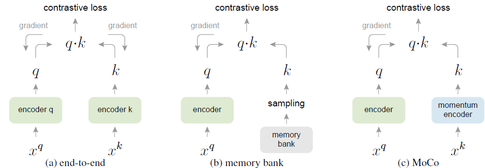 (b) : memory bank 방식은 데이터셋의 모든 sample representation으로 구성됩니다. 각각의 mini batch에 따른 dictionary는 back-propagation 없이 memory bank에서 무작위로 샘플링됩니다. 따라서 (a)에 비해서 큰 dictionary 크기를 가질 수 있겠지요.
