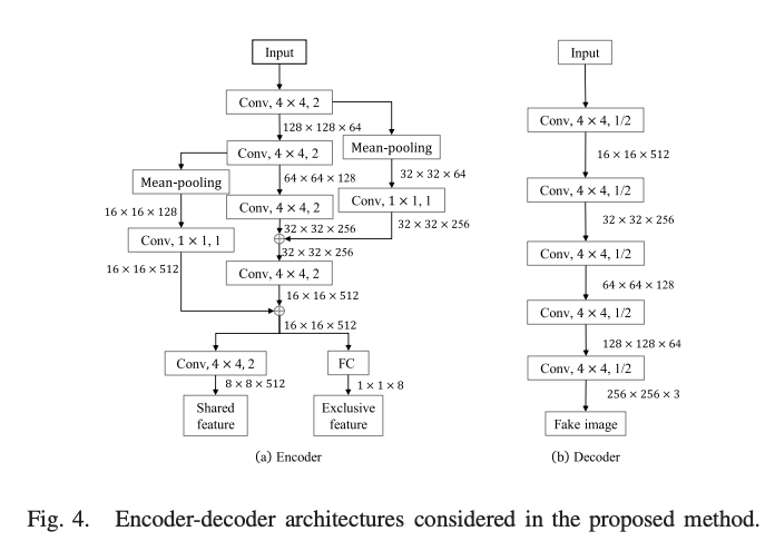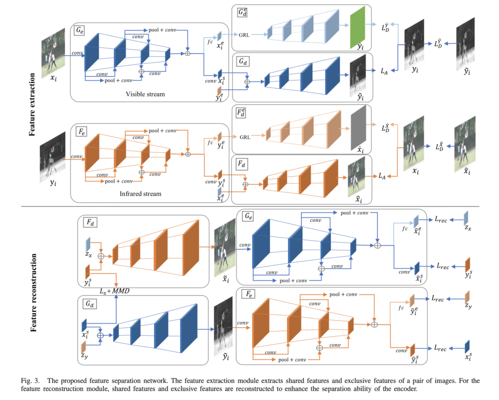 Exclusive feature x_{i}^{e}, y_{i}^{e} 는 두 모달리티의 독립적인 특징만을 가집니다. 즉, x_{i}^{e} 는 진짜 열화상 영상을 생성하지 못하고, 그 반대도 동일합니다. 이를 달성하기 위해 저자는 domain-agonostic을 학습하기 위한 도구인 Gradient Reversal Layer (GRL)을 적용합니다. GRL은 decoder G_{d}^{e} 의 앞단에 위치하며, decoder는 x_{i}^{e} 로부터 fake image \dot{y_{i}} 을 생성합니다. 다른 모달리티에서도 동일한 작업을 수행합니다.