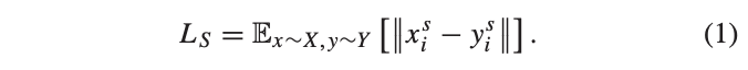 한 쌍의 컬러 영상과 열화상 영상들을 visible stream G_e , infrared stream F_e 에 각각 입력합니다. 두 encoder의 마지막 단에서 컨볼루션 레이어를 통해 shared feature x_{i}^{s}, y_{i}^{s} 를, FC 레이어를 통해 exclusive feature x_{i}^{e}, y_{i}^{e} 를 얻습니다. shared feature x_{i}^{s}, y_{i}^{s} 는 두 모달리티 간의 유사도 시각 정보를 가지고 있습니다. 저자는 해당 정보를 얻기 위해서 L1 Loss와 MMD(Maximum Mean Discrepancy) Loss를 이용하며 먼저 L1 Loss는 다음과 같은 방법을 사용합니다.