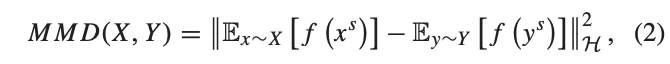MMD는 서로 다른 상대적인 분포간의 거리를 측정하기 위한 도구로, transfer learning 태스크에서 흔한게 많이 사용하는 Loss에 해당합니다. 해당 Loss는 source domain을 target domain으로 변환하기 위한 거리 값 최소화 도구로 사용합니다. 저자는 이에 대해 영감을 얻어 두 모달리티의 shared feature 간의 거리를 가깝게 만드는 용도로 사용합니다. MMD Loss는 다음과 같습니다.