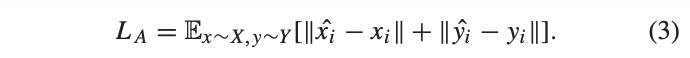 두 모달리티로부터 생성된 exclusive feature는 서로 교환되며, (x^{s}_{i}, y^{e}_{i}) G_d 에 전달되어 영상 /hat{y_{i}} 을 생성합니다. 반대 모달리티도 F_d 를 통해 영상을 생성합니다. 해당 기능은 영상 측면에서의 shared feature를 정렬하기 위해서 사용됩니다. alignment loss는 L1 Loss를 이용하며 다음과 같이 정의 됩니다.