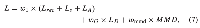 D()는 discriminator로 single scalar를 출력합니다. 각 decoder는 동일한 loss를 사용하며, 전체 loss는 아래와 같이 정의됩니다.
