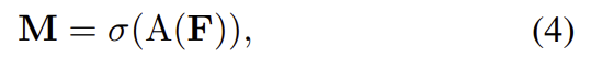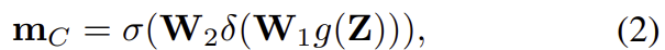 \mathbf{m}_{C}는 채널별 마스크로 SENet의 방식을 이용하여 생성하였으며 식으로 나타내면 아래의 식과 같습니다.