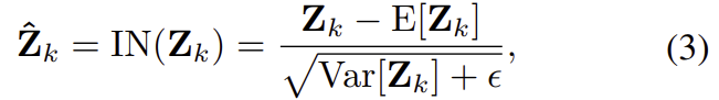 저자들이 이용한 방식은 channel attention-guided IN으로, 아래의 식으로 정리가 됩니다. 이때, \mathbf{Z}는 CNN을 통과하여 나온 feature map을 의미하며, \hat{\mathbf{Z}} \mathbf{Z} 에 IN이 적용된 결과를 의미합니다.