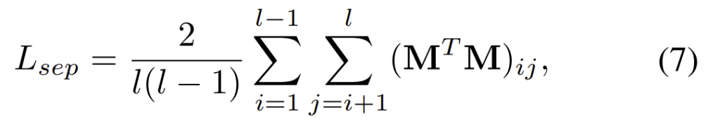 이때 (\mathbf{M}^T \mathbf{M})_{ij}\mathbf{M}^{h×w×l}\mathbf{M}^{hw×l}로 바꿔준 (\mathbf{M}^T \mathbf{M})의 i행, j열의 값으로, separation loss의 의미를 생각해보면, 각 pattern map별 상관관계가 낮아지도록 학습을 하는 것입니다.