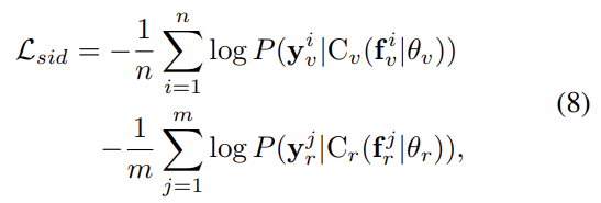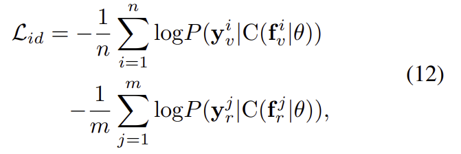 visible, 열화상 모달리티에서 추출한 feature map을 각각\mathbf{f}_v\mathbf{f}_r라 할 때, 각 모달리티별로 classifier를 통해 예측을 하고 cross entropy loss를 이용하여 loss를 구합니다.