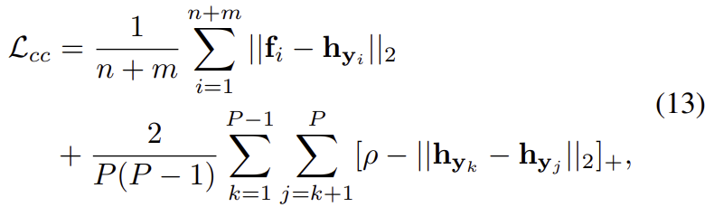 \mathbf{h}_{y_i}는 라벨 y_i에 대한 feature의 평균, P는 현재 batch의 id 갯수, \rho는 center간의 최소한의 마진