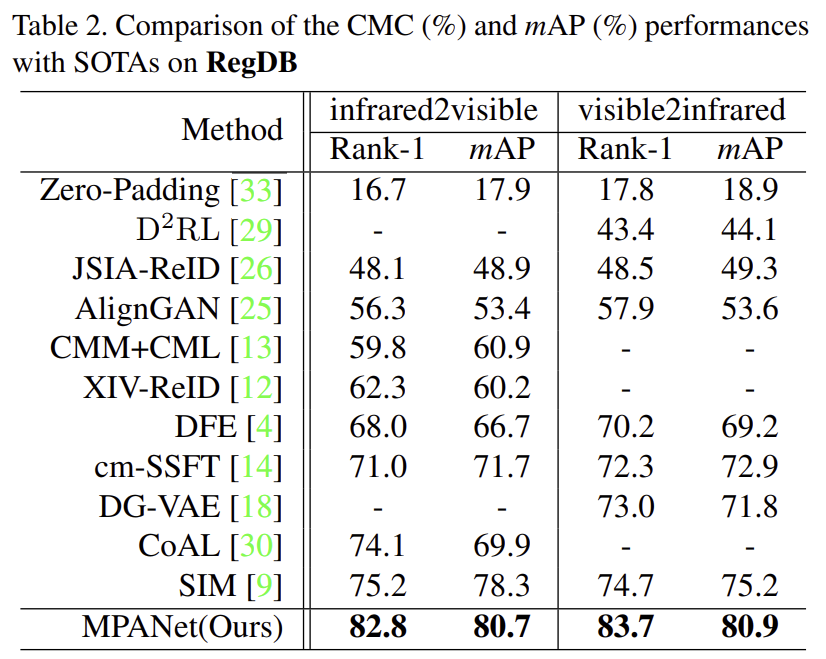 마찬가지로 cross-modal re-ID에서 많이 사용되는 두 데이터셋인 RegDB와 SYSU-MM01을 이용하였다고 합니다.