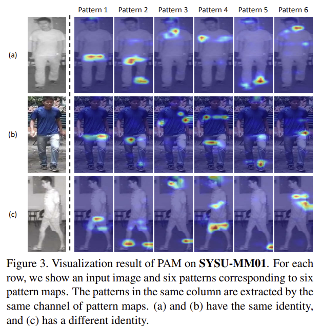 그림3은 pattern map을 시각화 한 것으로, k번째 열은 \mathbf{M}_k를 의미하며, 각 패턴 map을 통해 사람의 id나 포즈와 관계없이 특정 패턴에초점을 맞춘다는 것을 보였다고 합니다. (시각화 결과를 보았을 때 패턴 1,2,5은 사람의 비슷한 부분에 초점을 맞추었다는 설득이 되지만 3,4,6의 경우는 그렇지 않은 것으로 보이는데 조금 더 뒷받침할만한 결과가 있었으면 좋앗을 것 같습니다.)