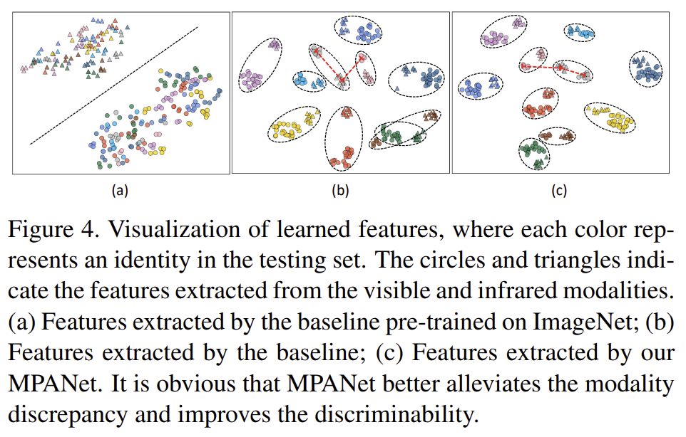 test 데이터 중 임의로 10개의 id를 골라 feature를 시각화 한 결과로 색은 id, 동그라미와 세모는 각각 visible, 열화상 이미지로부터 추출된 feature를 의미합니다. 시각화 결과를 보았을 때, MPANet을 이용한 경우 클러스터링이 더 잘 되어잇고, 동일한 id에 대해서 모달리티별 분포의 차이가 줄어든 것을 확인할 수 있습니다.
