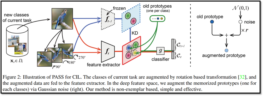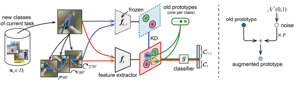 방법론은 다음과 같습니다. 먼저 forgetting 문제를 해결하기 위해 기존 데이터에 대한 prototype을 생성하고 저장하여 다음 task 학습시 사용하였는데요, prototype은 기존 데이터에서 같은 class에 속하는 데이터의 embedding feature들의 평균을 이용합니다. 또한 해당 embedding에 noise를 추가하여 augmentation을 해 다양성을 증가시킵니다.
