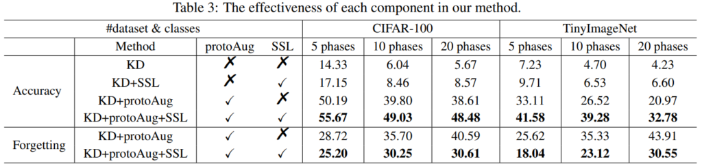 다음은 제안하는 아키텍쳐인 PASS의 ablation study 입니다. CIFAR-100과 TinyImageNet 데이터셋을 나누어서 각 n 개의 테스크(n phases)로 순차학습을 적용한 결과입니다. KD Loss 만 사용할때는 매우 낮은 성능을 보이며 CIL 이 실패하였음을 알 수 있습니다. KD에 SSL을 적용하므로써 성능이 약간 오른것을 확인할 수 있습니다. 이는 SSL이 classifier간의 imbalance 문제를 효과적으로 해결하여 일반화된 표현력을 지녔음을 알 수 있습니다. 한편 KD에 protoAug를 적용하였을때는 성능이 크게 올랐음을 통해 CIL이 효과적으로 진행되었음을 알 수 있습니다. 마지막으로 모두 적용한 결과가 가장 높은 성능을 보였음을 확인할 수 있습니다.