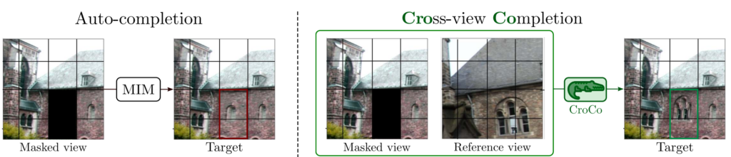 그림1. Single image로 학습하는 기존 MAE 방법론(좌), 두 영상의 relationship을 학습하는 CroCo(우)