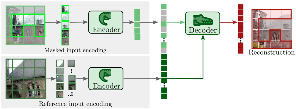 아무튼 90% 비율로 x_{1}에 대하여 랜덤하게 마스킹을 수행하며, 반대로 reference image인 x_{2}는 masking을 일절 적용하지 않습니다. 그리고 나서 이 각각의 non-overlapping patch를 각각 p_{1}, p_{2} 라고 하였을 때, 이들을 각각 encoder 및 decoder에 태워서 masking된 patch \hat{p}_{1} 을 reconstruction 합니다.