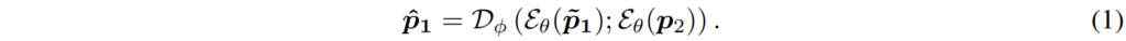 여기서 사용된 encoder의 경우에는 잘 아시다시피 ViT를 활용하였으며, 입력 영상이 p_{1}, p_{2}로 두 장이라 하더라도 동일한 encoder를 사용하여 encoding 합니다. 즉 weight shared encoder를 활용한다는 것이죠. 논문에서는 실험에서 224 x 224 해상도에 패치 사이즈는 16 x 16을 활용했다고 합니다.
