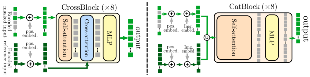 그림3. 두 종류의 Decoder Block, Cross attention 연산이 들어간 Crossblock(좌)와 Decoder 입력 전에 Concat하는 CatBlock(우)