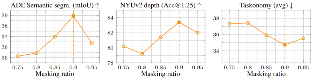 먼저 논문의 ablation study 결과부터 살펴보겠습니다. 첫번째 ablation 실험은 masking ratio 관련된 내용입니다. 아까 본문에서도 말씀드렸다시피, masking ratio를 90%를 하였을 때 가장 좋은 성능을 보여준다고 했었는데, 실제로 transfer learning할 때 ADE Segmentation, NYU depth estimation 그리고 다양한 multi-task가 존재하는 taskonomy 데이터 셋에서 모두 90% masking을 하였을 때 가장 좋은 성능들을 보여주고 있습니다.(아래 그림 참조)