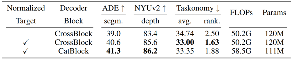 구체적으로 CatBlock을 적용한 경우 ADE 20K 데이터 셋과 NYUv2 데이터 셋에서 더 좋은 결과를 보여주고 있지만, 반대로 Cross-Block의 경우에는 Taskonomy 데이터 셋에서 더 좋은 성능을 보여주는 모습입니다. 논문에 저자는 최종적으로 Cross-Block을 채택한 모습인데, 아무래도 학습해야 할 파라미터 수 보다는 추론 속도 측면이 더 중요하기 때문에 CrossBlock 구조를 채택한 것으로 생각됩니다.