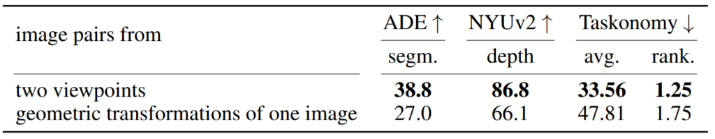 해당 실험 결과는 표2에서 확인하실 수 있는데, 요약하면 다양한 조건의 two viewpoint 영상으로 학습한 결과와 달리 하나의 영상에 대해 랜덤한 변화를 통해 학습한 데이터 셋이 모든 데이터 셋에서 좋지 못한 결과를 보여주었습니다.