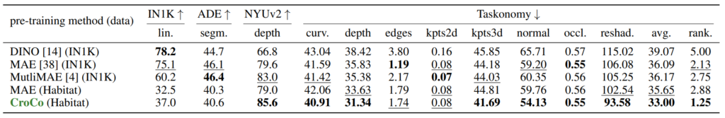 다만 이러한 결과는 pixel level prediction인 segmentation과 Depth estimation 등에서 DINO보다는 CroCo가 훨씬 더 좋은 모습들을 보여주고 있습니다. 실제로 표3을 다시 살펴보시면, 1등(bold체)과 2등(밑줄)을 CroCo가 대부분 차지하는 모습입니다.