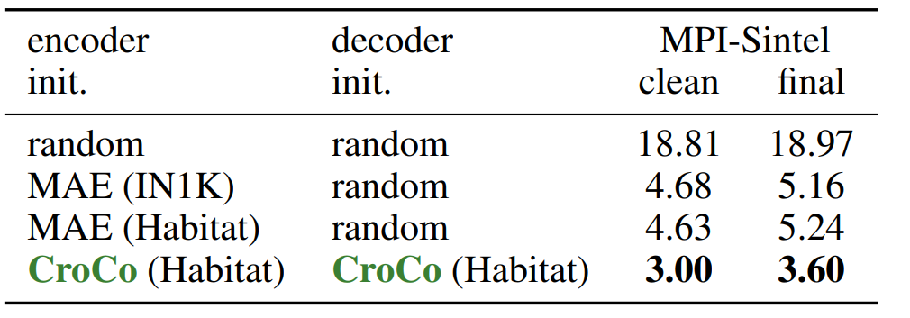 이는 Decoder에 Cross-attention layer 연산이 들어가 있기 때문에, source imaeg와 target imaeg 간에 연관성을 중요하게 보는 분야들(Stereo depth estimation, optical flow 등등)에서 Croco의 decoder를 충분히 활용할 수 있고, 실제로 좋은 성능을 보여주었다고 합니다.