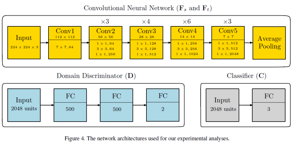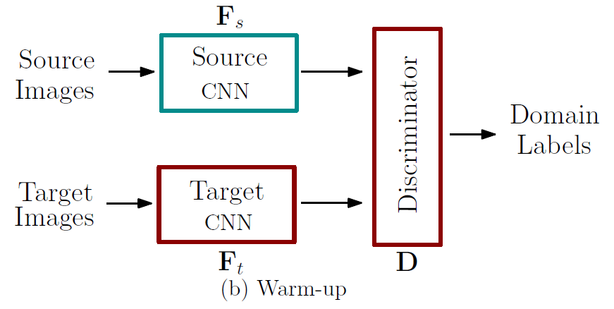 우선 (a) pre-training 단계에서 source feature extractor와 classifier를 source domain에 맞게 학습시킨 뒤, (b) warm-up 단계에서 Discriminator를 통해 target feature extractor가 source와 유사한 feature를 추출하는 방향으로 학습이 일어나는 것입니다. 그렇게 되면 target feature extractor 를 통해 추출한 target feature도 앞선 source domain에 맞게 학습된 classifier로 잘 분류가 가능하겠지요. 저자는 이러한 학습 효과를 기대했습니다.
