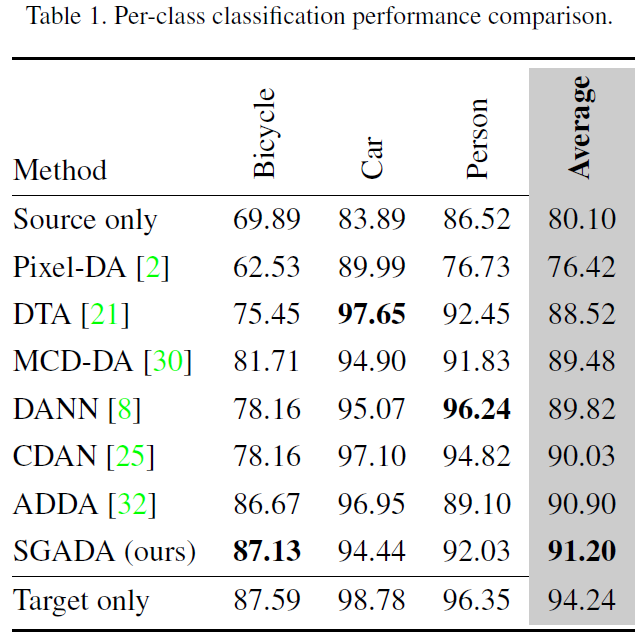 해당 표에서 Source only란 Source image로 학습한 모델을 통해 Target image를 예측 한 성능입니다.