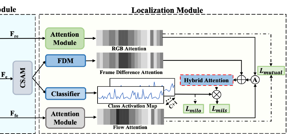 빨간색 점선으로 표시한 부분이 본 논문의 핵심 contribution입니다. 그림의 아래 부분에서 TSCM, CSAM은 생각보다 단순한 구조로 이루어져있는 것을 알 수 있습니다. 더불어 Localization Module의 Hybrid Attention도 핵심으로 표시되어 있는데, 이는 뒤에서 설명드리겠습니다.