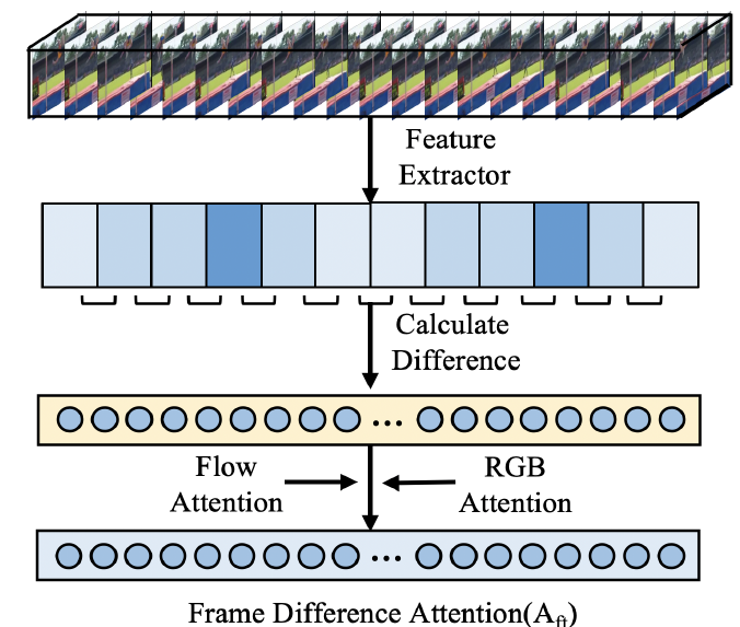 Hybrid attention에 포함될 Frame Difference Attention(A_{ft})를 얻는 것이 FDM의 목적입니다. 저자는 action에서 background로, background에서 action으로 전환되는 시점에서 feature의 L1-norm이 크게 변화한다는 관찰을 이용합니다. 그림 6에서 Calculate Difference 과정에서 다음 클립 feature와의 L1-norm 차이를 구해줍니다. 0번 클립과 1번 클립 L1-norm 차이를 1번 위치에 넣어주는 식으로 계산되고 0번 자리는 ‘0’으로 채워주게 됩니다. 이렇게 얻은 attention score가 F_{t}입니다.