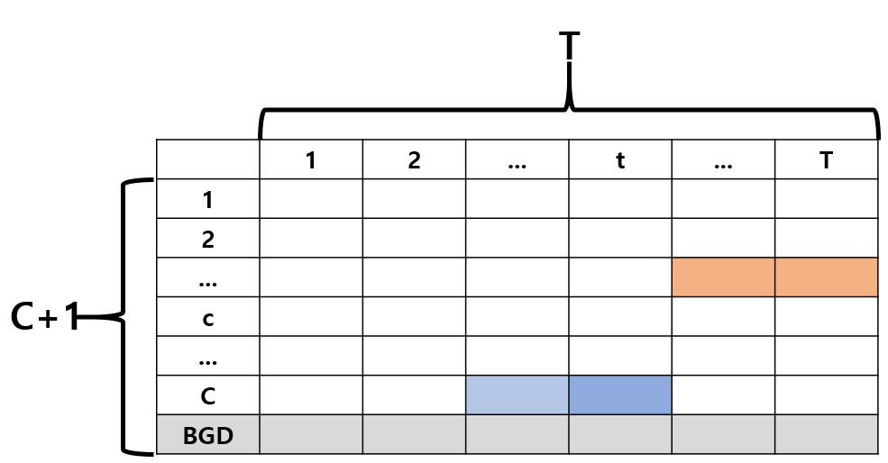 WTAL task 연구의 발전을 이야기할 때 Temporal Class Activation Map(TCAM)은 빠질 수 없습니다. TCAM은 위 그림 1처럼 데이터셋에 존재하는 클래스에 대해 하나의 비디오가 구간 1부터 T까지의 clip으로 나눠져 있을 때 각 clip이 각 클래스에 해당할 확률값을 담고 있는 형태였습니다.